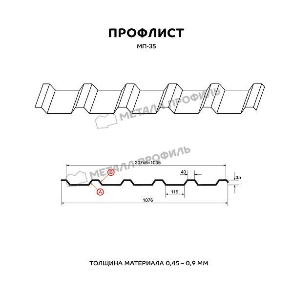 Профлист МЕТАЛЛ ПРОФИЛЬ МП-35x1035-B (VikingMP-01-9005-0,45) — популярный материал для монтажа профилированного листа. Представляет собой металлический оцинкованный лист с покрытием. Толщина металла с оцинковкой и защитно-декоративным покрытием — 0.45 мм. После проката на специальном оборудовании металл приобретает рисунок из повторяющихся волн. Такая конфигурация придает профилю жёсткость.Профиль МП-35:
