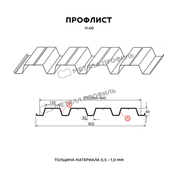 Профлист МЕТАЛЛ ПРОФИЛЬ Н-60x845-A NormanMP (ПЭ-01-1015-0,5) часто используется для монтажа профилированного листа. Представляет собой лист оцинкованной стали с покрытием. Толщина стальной основы с оцинковкой и защитно-декоративным покрытием составляет 0.5 мм.После проката на специальном оборудовании металл принимает волнообразный вид. Жёсткость профилированного листа гораздо выше плоского.